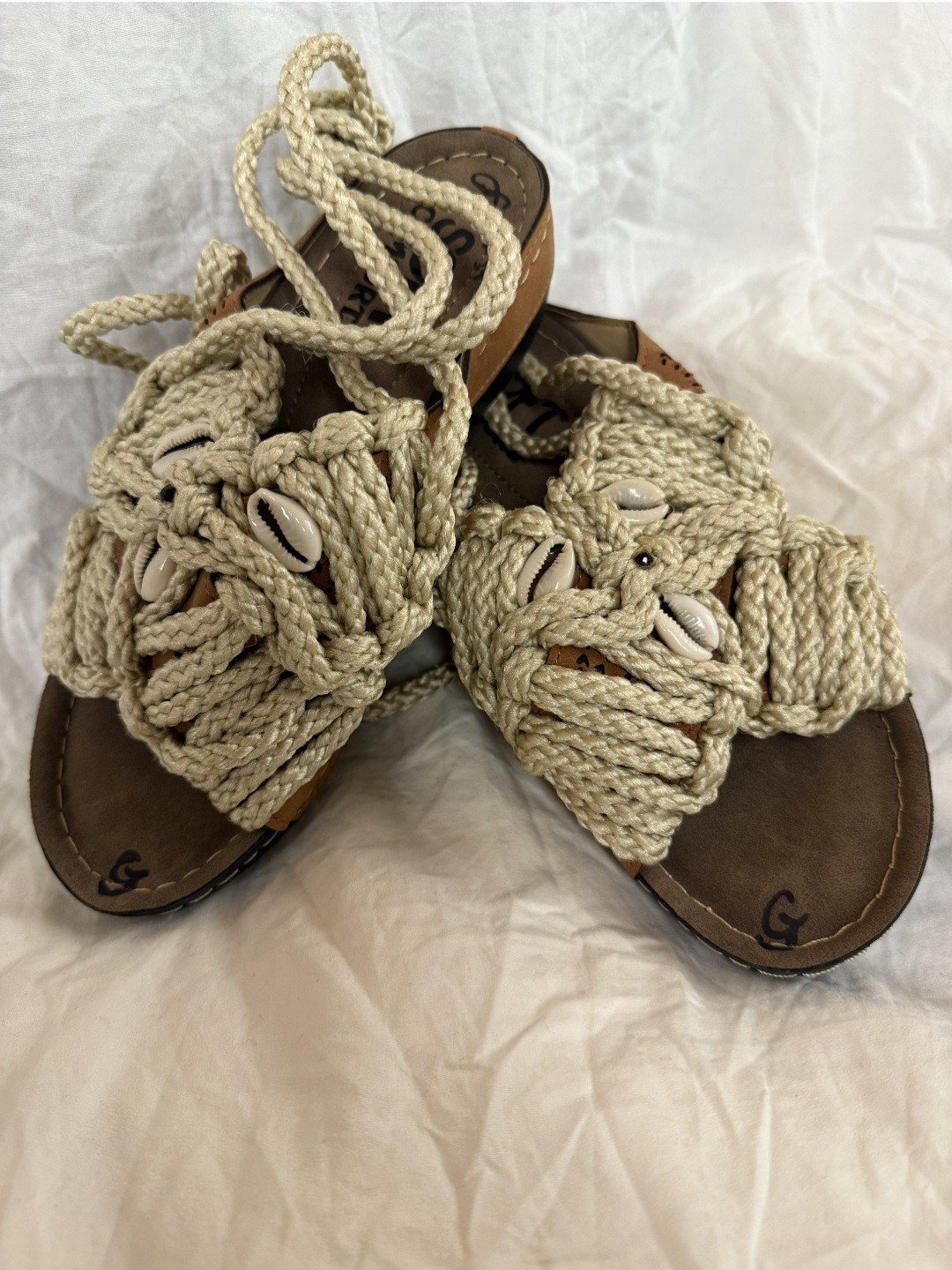 Embrace natural beauty and handcrafted artistry with the GwenJ Pebble Wrap-Up Sandals, designed for the free spirit with refined taste. These stunning sandals feature intricately handwoven macramé cords in a soft, neutral tone accented by authentic cowrie shells — a timeless symbol of strength and beauty.