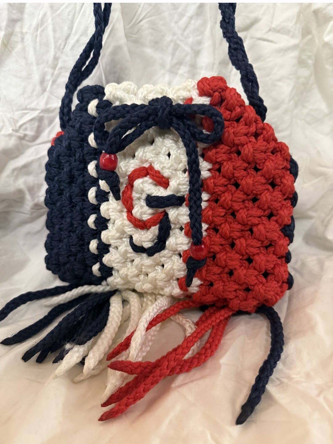 Show your patriotic pride with this one-of-a-kind macramé crossbody handbag, handcrafted with bold red, white, and navy blue cord. The Spirit of America bag features a detailed woven pattern with playful fringe accents and a secure drawstring closure, finished with hand-beaded details for an artisanal touch.