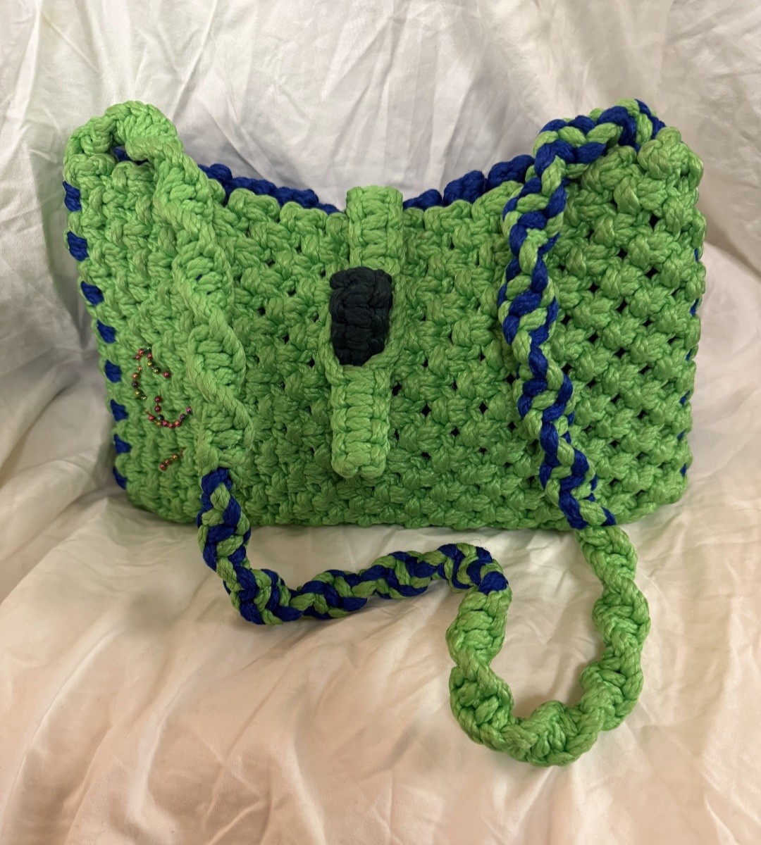 Make a bold and beautiful statement with the GwenJ Mix Handbag, a vibrant handcrafted macramé design that blends creativity, color, and character. The striking lime green and royal blue cord combination gives this bag a fresh, lively look — perfect for those who love to stand out in style.
