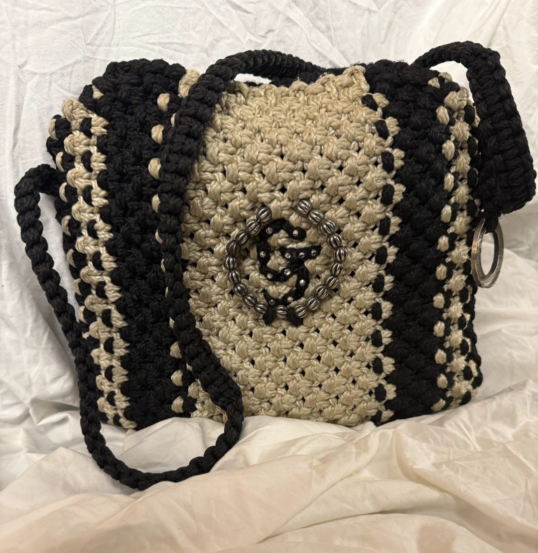 The JD Black Pearl Vintage Handbag embodies classic sophistication with a handcrafted macramé design in rich black and champagne tones. Its textured weave showcases impeccable craftsmanship, while the centerpiece—a circle of silver-toned beads encasing the signature “G” emblem—adds a touch of luxury and artistry.